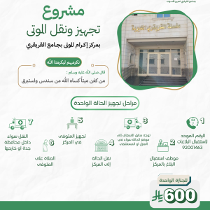 مبادرة كفالة تجهيز المتوفى بمركز إكرام الموتى بجامع القريقري إختر قيمة التبرع 200 ريال 300 ريال 400 ريال 500 ريال 600 ريال مبلغ خاص 0,00 ر.س تحقق من 918.000,00 ر.س تبرع الأن