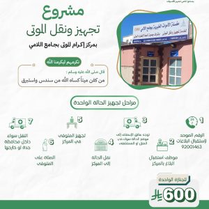 مبادرة كفالة تجهيز المتوفى بمركز إكرام الموتى بجامع اللامي إختر قيمة التبرع 200 ريال 300 ريال 400 ريال 500 ريال 600 ريال مبلغ خاص 0,00 ر.س تحقق من 540.000,00 ر.س تبرع الأن