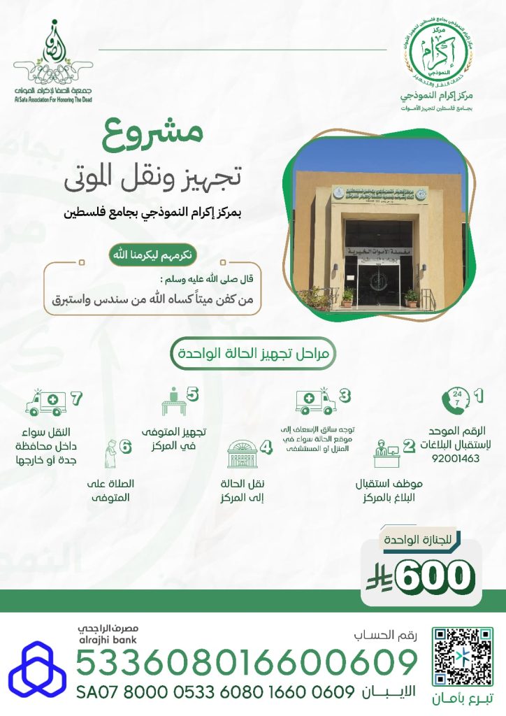 مبادرة كفالة تجهيز المتوفى بمركز إكرام النموذجي بجامع فلسطين إختر قيمة التبرع 200 ريال 300 ريال 400 ريال 500 ريال 600 ريال مبلغ خاص 300,00 ر.س تحقق من 1.458.000,00 ر.س تبرع الأن